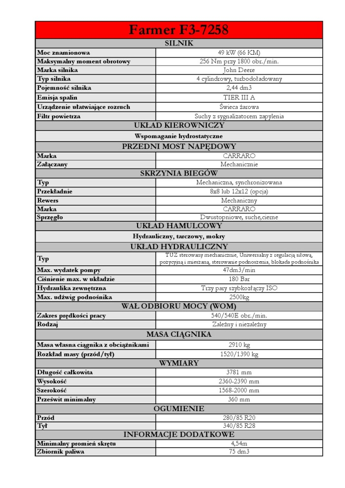 Ciągniki FARMER F3 ze względu na mały rozstaw kół są przeznaczone do prac w sadownictwie i warzywnictwie. Niewielkie gabaryty ciągnika czynią z niego dobrego pomocnika w gospodarstwie przy pracach ogólnych. Maszyna zbudowana jest przy wykorzystaniu 4 cylindrowego silnia John Deere o pojemności 2,44 dm3 i skrzyni biegów renomowanego producenta Carraro. Ciągnik są wyposażone w skrzynię 8x8 z rewersem mechanicznym, a maksymalna szybkość jazdy to ok 40km/h.
